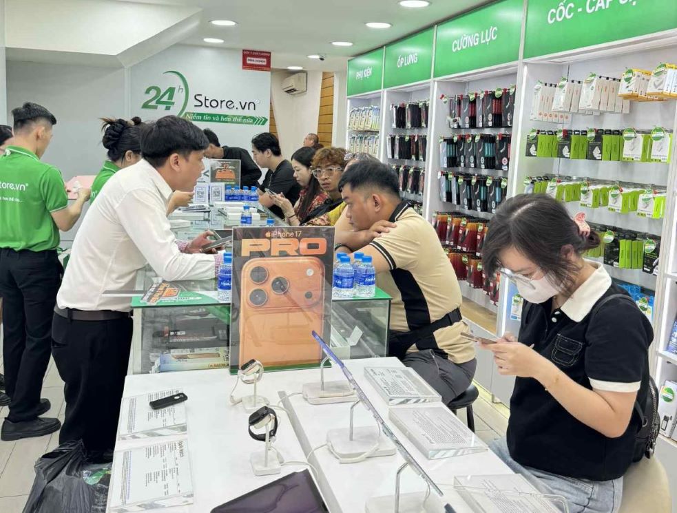 Theo đó, quá trình giao máy diễn ra theo từng nhóm, khách hàng lần lượt nhận iPhone 17 kèm theo quà tặng từ cửa hàng. Song song đó, đội ngũ kỹ thuật cũng hỗ trợ kiểm tra IMEI, hướng dẫn kích hoạt, đồng thời giải đáp các câu hỏi cơ bản của khách hàng đã tin tưởng đồng hành cùng 24hStore.