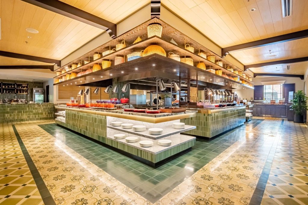 Tiếp đến là khu vực món Âu, nơi thực khách sẽ khó có thể bỏ qua đùi heo muối Serrano, các loại phô mai và thịt nguội, bò bít tết, đùi cừu nướng… Bên cạnh đó là vô vàn lựa chọn từ quầy món Á như sashimi cá ngừ Đại Dương, bạch tuộc đỏ Tako, cá hồi, sushi Nhật Bản, canh Tom Yum nóng hổi, cùng các món ăn truyền thống Việt Nam… Cuối cùng, dừng chân tại những quầy tráng miệng rực rỡ màu sắc, để kết thúc bữa tối của bạn theo cách vừa ngọt ngào, vừa thú vị.