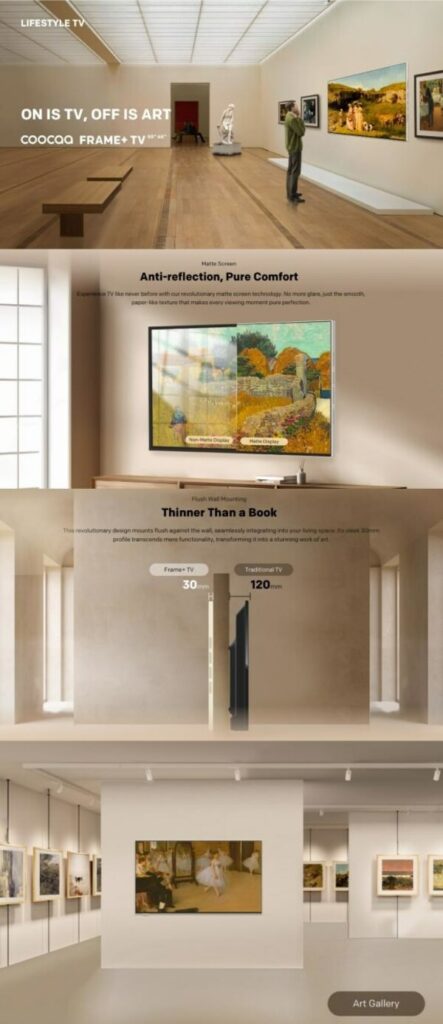 Không khí nghệ thuật toát ra từ Frame+ TV LN7000G bắt nguồn từ mục tiêu theo đuổi tính thẩm mỹ cao nhất của coocaa. Đây không chỉ là chiếc TV mà còn là chiếc đèn nghệ thuật soi sáng cho cuộc sống. Frame+ TV mang nghệ thuật và cuộc sống đến gần nhau hơn. Frame+ TV không còn chỉ là TV mà là sự kết hợp hoàn hảo giữa nghệ thuật và cuộc sống. Frame+ TV tạo ra một phòng trưng bày nghệ thuật riêng tại nhà một cách thoải mái và dễ chịu, mang đến cho người dùng trải nghiệm cuộc sống mới.