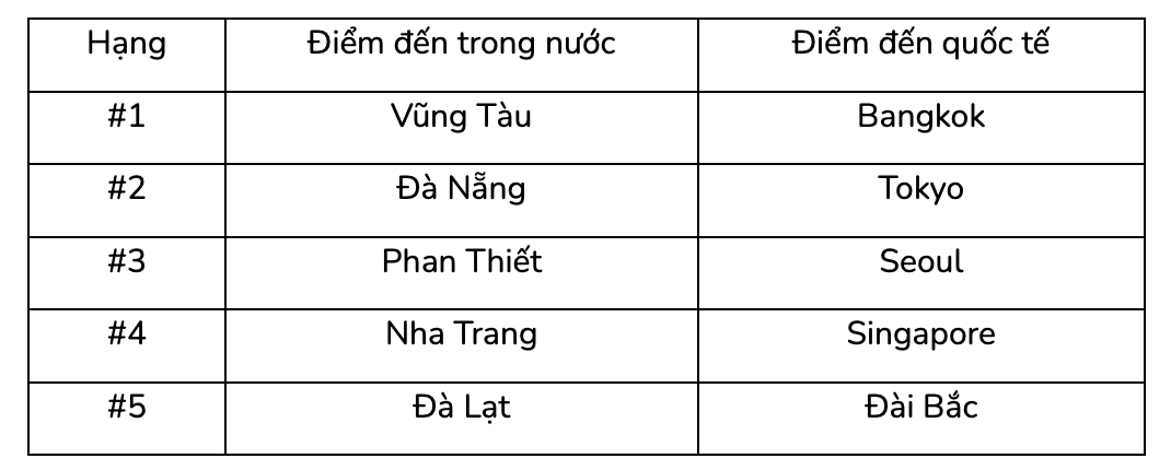 Các điểm đến ven biển dẫn đầu trong danh sách du lịch nội địa, dữ liệu Agoda cho thấy, bốn trên năm điểm đến nội địa được du khách Việt tìm kiếm nhiều nhất là các thành phố biển, bao gồm: Vũng Tàu (tăng 101% so với năm ngoái), Nha Trang (tăng 96% so với năm ngoái), Đà Nẵng (tăng 89% so với năm ngoái) và Phan Thiết (tăng 72% so với năm ngoái). Đà Lạt (tăng 45% so với năm ngoái) là điểm đến không có biển duy nhất lọt vào bảng xếp hạng, thu hút du khách nhờ khí hậu mát mẻ, phù hợp cho chuyến du lịch ngắn ngày để “trốn nắng”. Trong bối cảnh Việt Nam đang bước vào đợt nắng nóng gay gắt sớm hơn mọi năm, nhiệt độ được ghi nhận gần 40 độ ở nhiều nơi trên toàn quốc, nhiều du khách có xu hướng tìm kiếm những nơi có khí hậu mát mẻ hơn.