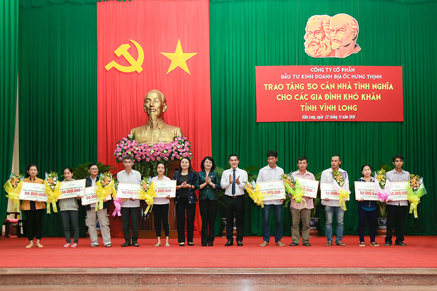 Để tạo điều kiện cho người dân có hoàn cảnh khó khăn sớm ổn định cuộc sống, sáng ngày 22/11 tại Hội trường Tỉnh Ủy tỉnh Vĩnh Long, Hung Thinh Corp đã phối hợp với địa phương tổ chức buổi lễ trao tặng 50 căn nhà tình nghĩa đến các gia đình khó khăn tại Vĩnh Long với tổng kinh phí 2,5 tỷ đồng. Chương trình vinh dự khi nhận được sự đồng hành và tham gia của bà Đặng Thị Ngọc Thịnh – Ủy viên BCH Trung ương Đảng, Phó Chủ tịch Nước Cộng hòa Xã hội Chủ nghĩa Việt Nam.