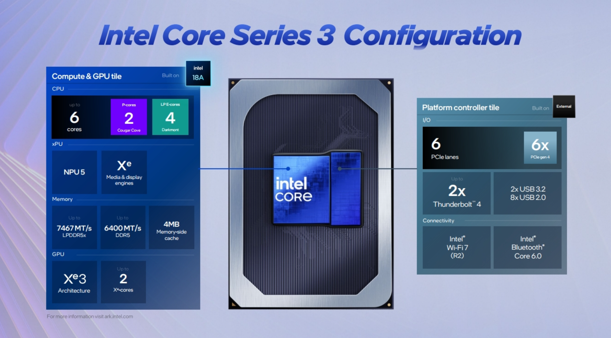 Hướng tới sự cân bằng giữa hiệu năng và giá thành, Intel Core Series 3 được xây dựng trên nền tảng ưu việt của dòng Intel Core Ultra Series 3 (tên mã Panther Lake) và sản xuất trên tiến trình Intel 18A tiên tiến nhất của hãng. Dòng vi xử lý mới hứa hẹn thay đổi toàn diện trải nghiệm điện toán cho trường học, doanh nghiệp nhỏ, và người dùng chú trọng tối ưu chi phí thông qua việc cung cấp tính năng thiết thực nhất ở quy mô triển khai vượt trội. Hơn 70 thiết kế sản phẩm từ nhiều đối tác hàng đầu, đa dạng về tính năng, và kiểu dáng, dự kiến sẽ được ra mắt trong vài tháng tới.