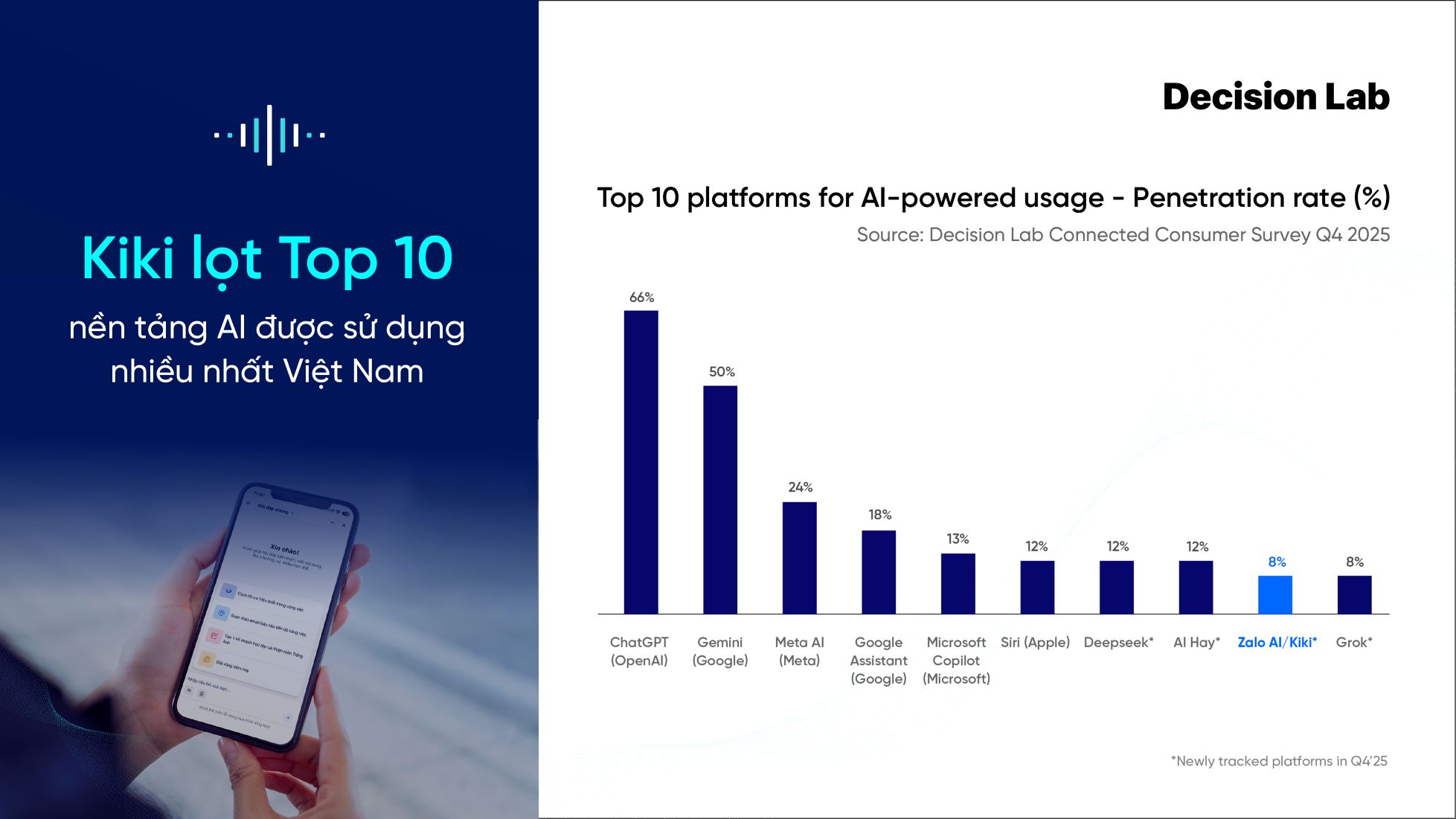 Theo báo cáo The Connected Consumer – Quý 4/2025 do Decision Lab công bố, Kiki Info là một trong những nền tảng AI được sử dụng phổ biến nhất tại Việt Nam, tiếp tục đưa thương hiệu Việt tỏa sáng hơn so với các công cụ hiện có.