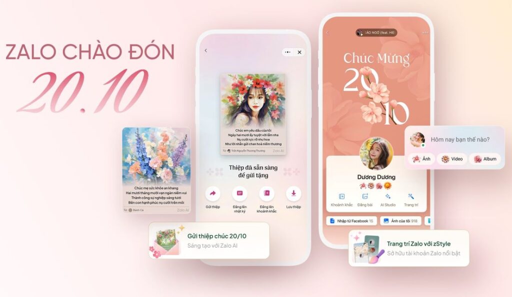 Theo đó, người dùng Zalo có thể khám phá tính năng “Cùng Zalo chúc mừng 20/10” ngay trong phần “Tin nhắn” hoặc “Nhật ký” với hai lựa chọn hoạt động “Trang trí Zalo” với hình nền, nhạc chờ 20/10 và “Gửi thiệp chúc 20/10” với những sáng tạo độc đáo cùng thiệp Zalo AI.