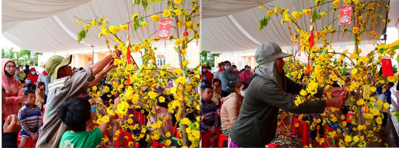 Tại “Siêu thị mini Tết 0 đồng” ở TX. Phước Long (Bình Phước), hàng trăm người dân địa phương đã có mặt từ sáng sớm để phấn khởi đi chợ Tết miễn phí với những giỏ quà đầy yêu thương. Một chị phụ nữ trạc tứ tuần đến thật sớm để đi chợ, nhận quà và kịp đi bán cho hết sấp vé số cầm trên tay trong lúc một bác trai lớn tuổi mong có thể đi chợ miễn phí sớm để kịp về chạy thận.