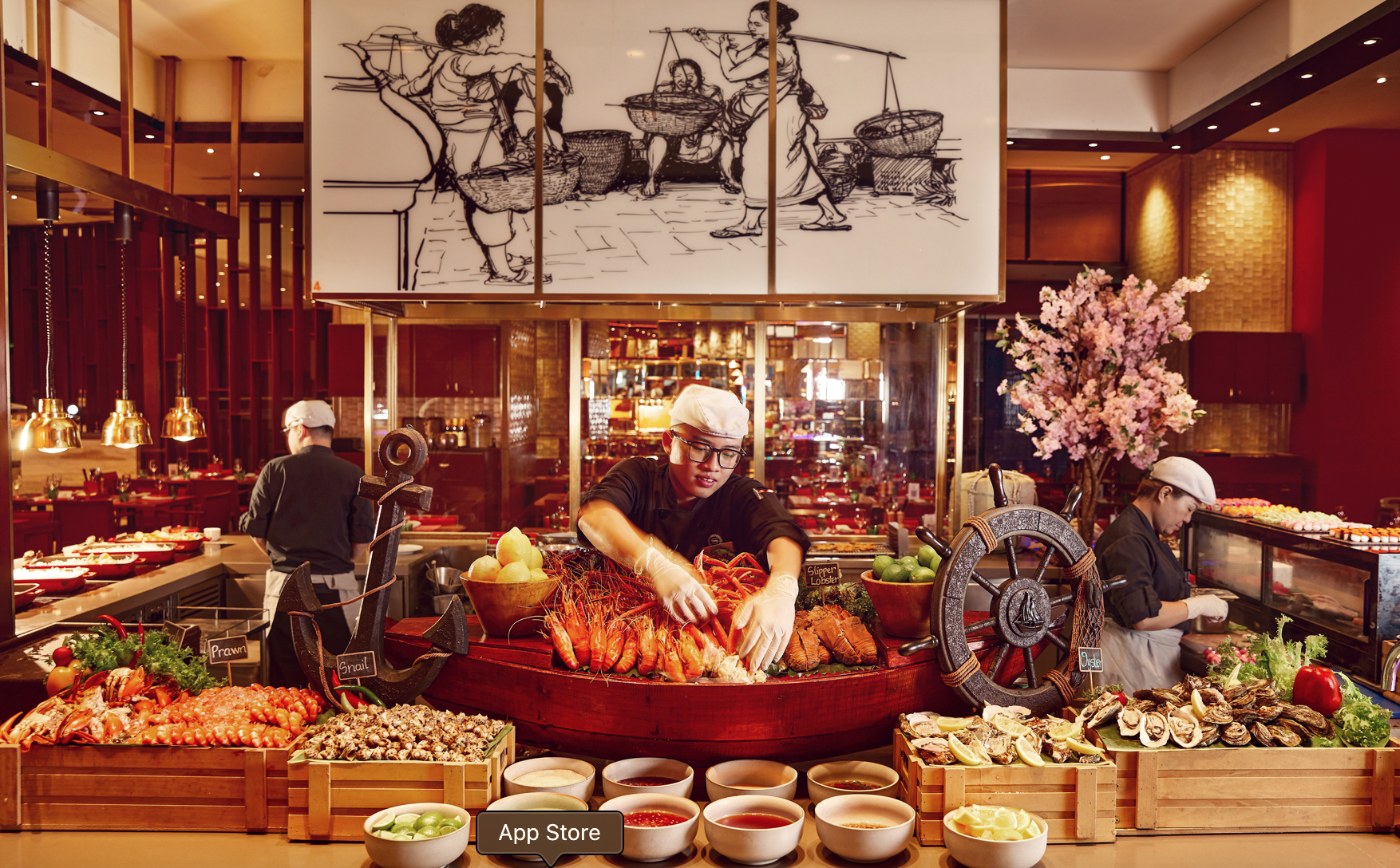 Trong dịp lễ này, nhà hàng phục vụ buffet hải sản cao cấp cùng đa dạng món Âu – Á, được chế biến trực tiếp tại 7 quầy bếp tương tác.Thực khách có thể thưởng thức sashimi cá hồi Na uy, cá ngừ, cua hoàng đế Alaska,, gan ngỗng áp chảo, hàu Pháp,bò Wagyu thượng hạng, cùng các món Việt truyền thống.
