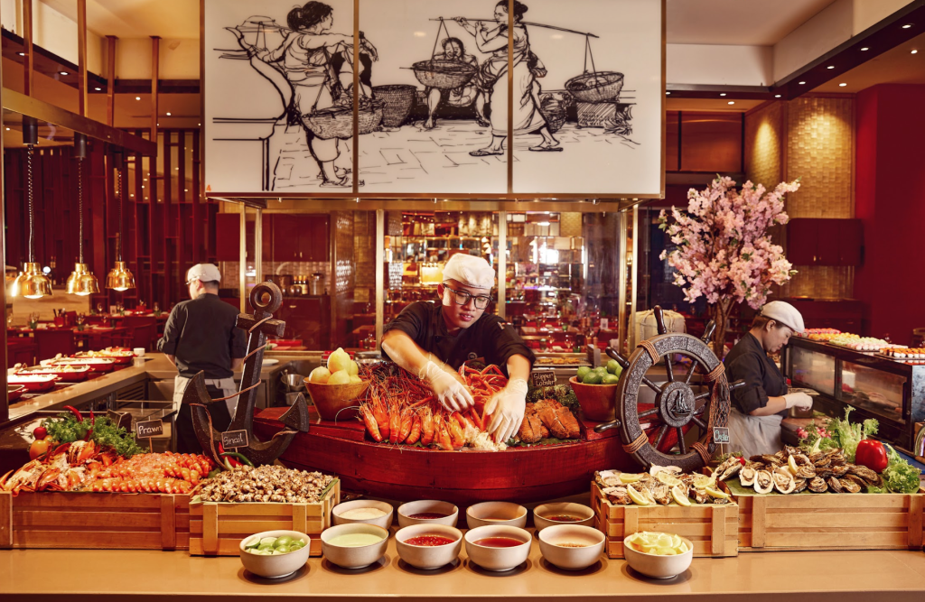Trong khi đó, Saigon Café mang đến không gian buffet hải sản cao cấp – nơi những bữa ăn đầu năm trở thành khoảnh khắc gắn kết. Thực đơn quy tụ sashimi cá hồi, cá ngừ ủ khô, cá cam, gan ngỗng, bào ngư, hàu tươi, bò dry-aged xốt truffle cùng các món Tết truyền thống như bánh chưng nhà làm. Buffet được phục vụ từ 15.2 – 22.2.2026 với giá 1.588.000 đồng++/khách; riêng đêm Giao thừa và mùng 1 Tết là 1.988.000 đồng++/khách, bao gồm đồ uống không giới hạn.