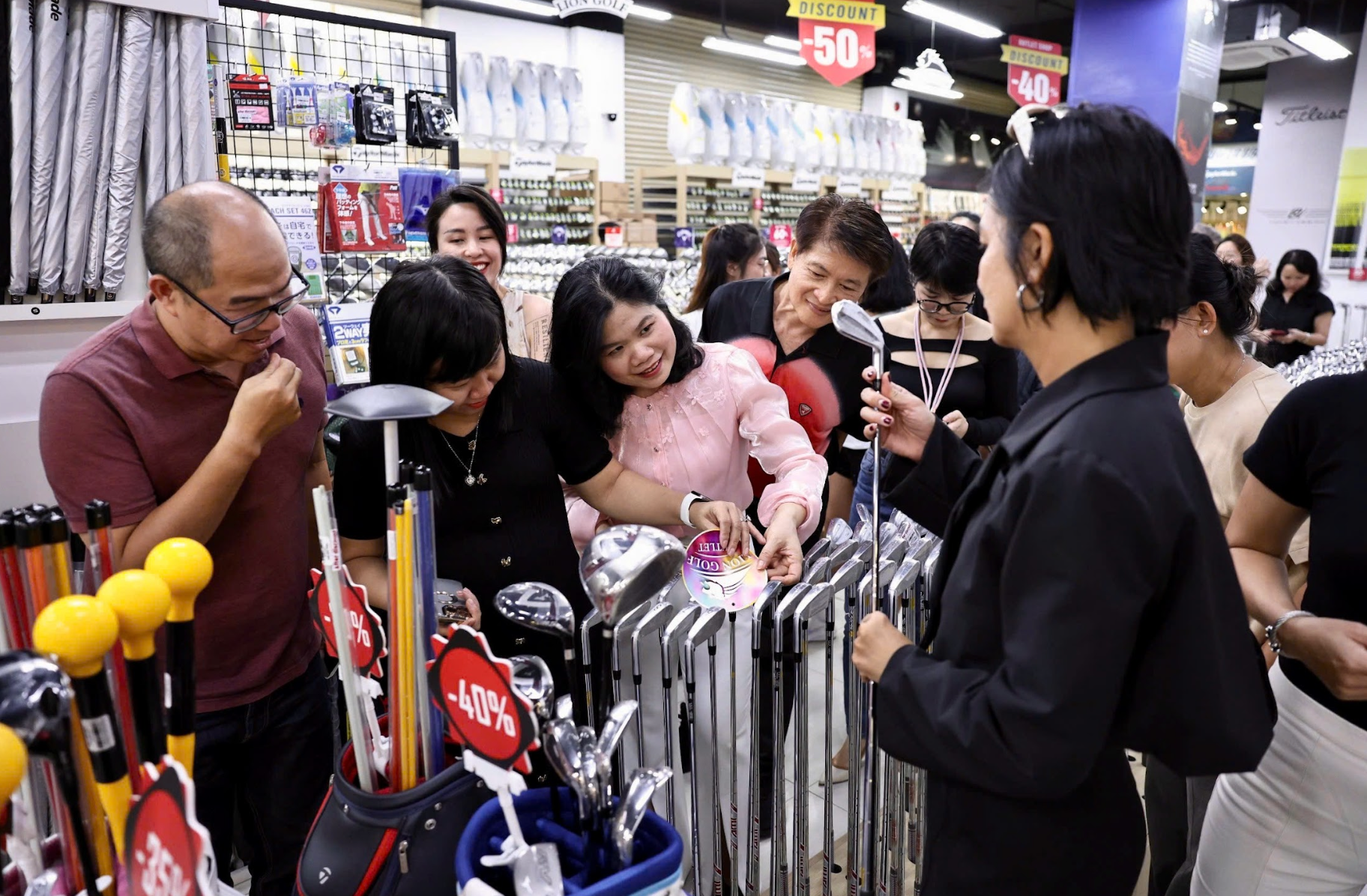 Cùng với trải nghiệm chơi golf, khách có thể tham quan không gian của Lion Golf Outlet, được giới thiệu là một trong những không gian mua sắm golf lớn nhất Việt Nam hiện nay. Lion Golf trưng bày đa dạng các sản phẩm golf chính hãng từ nhiều thương hiệu hàng đầu trong lĩnh vực này, bao gồm gậy golf, trang phục, phụ kiện và dụng cụ luyện tập, đáp ứng nhu cầu từ người mới bắt đầu cho đến golfer kinh nghiệm. Điểm khác biệt của mô hình Outlet nằm ở chính sách giá ưu đãi hấp dẫn, với mức giảm lên đến 60% cho nhiều sản phẩm, giúp người tiêu dùng dễ dàng tiếp cận các sản phẩm golf chất lượng cao với chi phí hợp lý. Đây được xem là một bước đi chiến lược, góp phần thúc đẩy sự phát triển bền vững của thị trường golf tại Việt Nam, đồng thời mở rộng tệp khách hàng và cộng đồng yêu golf.