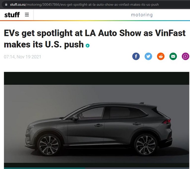 TờStuff của New Zealand đưa tin về LA Auto Show – nơi theo đánh giá xe điện “chiếm sóng” với cuộc đổ bộ của VinFast. Ngoài những thông số kĩ thuật về VF e35 và VF e36, điều đáng chú ý được Stuff nói về VinFast là kế hoạch bán xe thông qua mạng lưới trực tiếp của hãng này. Tờ báo này tiết lộ về kế hoạch mở 60 showroom tại California trong thời gian tới của VinFast.