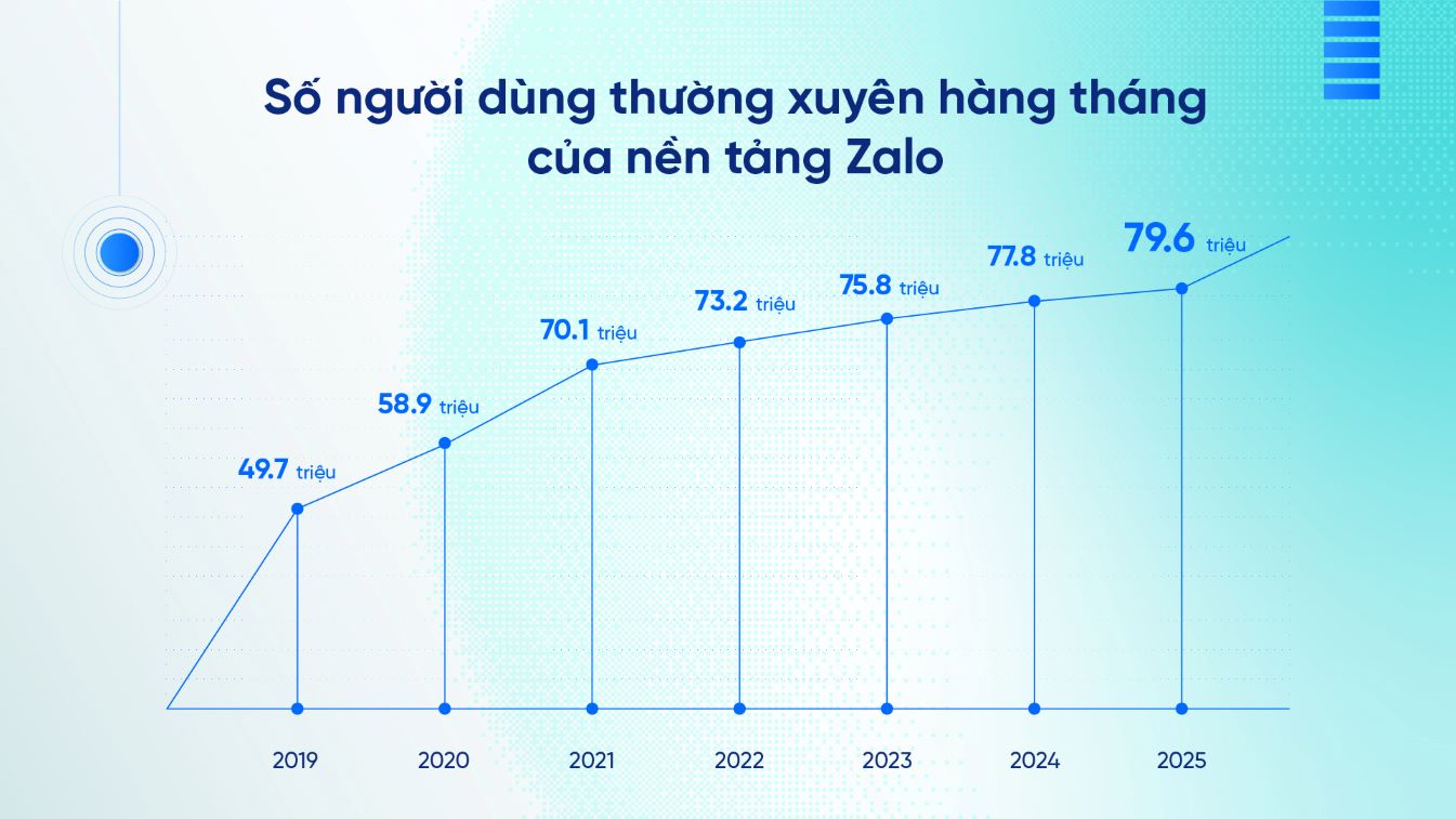 Khép lại năm 2025, nền tảng nhắn tin Zalo ghi nhận sự tăng trưởng tích cực. Từ 77,8 triệu người dùng thường xuyên hàng tháng vào cuối năm 2024, chỉ sau 1 năm, Zalo tăng thêm gần 2 triệu người dùng, ghi nhận 79,6 triệu người dùng thường xuyên hàng tháng, tính đến tháng 12/2025.